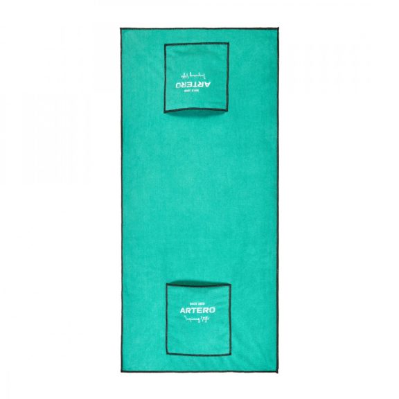 Türkiz színű, antracit színű szegéllyel, fehér hímzett logóval, visszazárható tasakban.