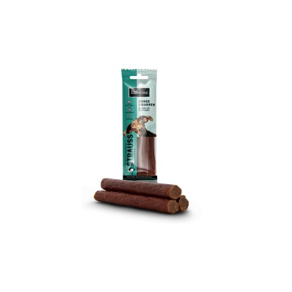 Összetevők: strucchús 94%, málna 2%, ribizli 2%, kollagén bél 2%.