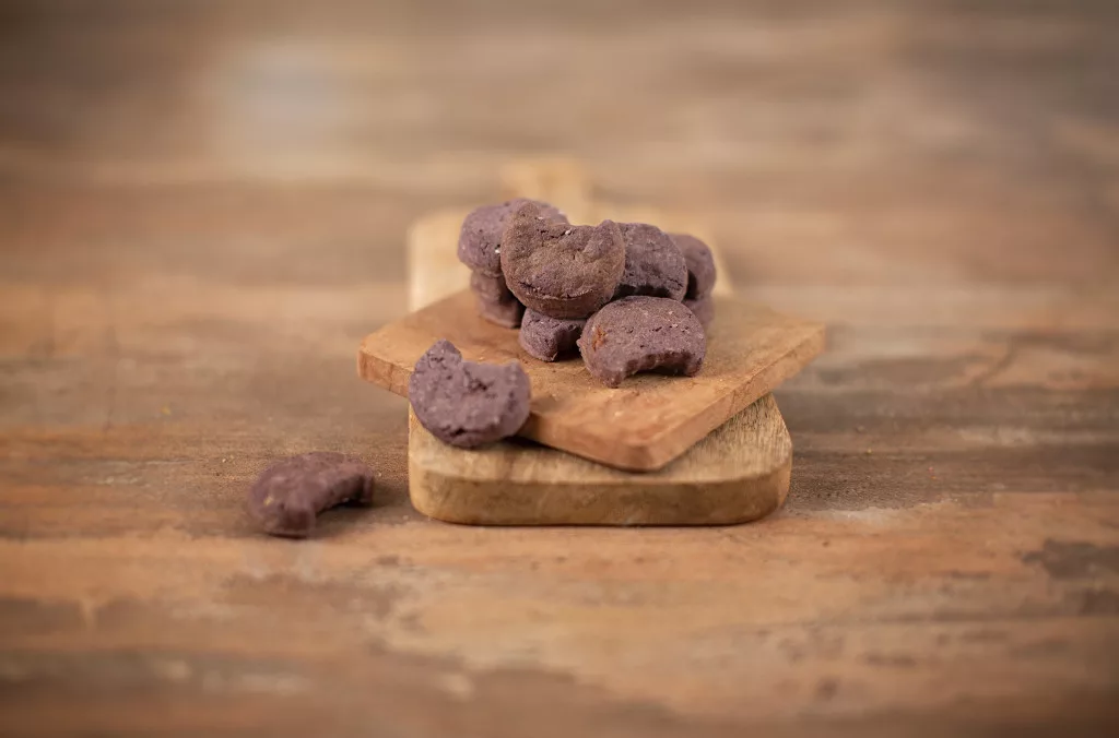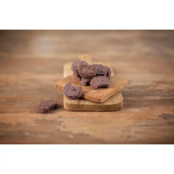 A friss pulykahús és máj kiváló minőségű, könnyen emészthető fehérjét biztosít, míg a sajt ízletes, természetes kalciumforrás. A hibiszkuszvirágok és a topinambur támogatják az emésztést, a chia mag pedig értékes omega-3 zsírsavakat tartalmaz. Egy igazi nyugtató, kiegyensúlyozott snack estére – egy csipetnyi szeretettel és mesterséges adalékok nélkül.