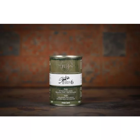 Összetétel: 75% kecskehús (55% izomhús,10% belsőség (máj, szív, vese, lép), 10% húsos csont), 10% topinambur, 5% túró, 5% spenót, 2% uborka, 2% alma, 0,9% kamilla, 0,1% tengeri alga