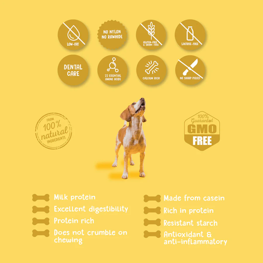 A rágócsont glutén- és gabonamentes, laktózmentes, így érzékeny emésztésű vagy ételallergiára hajlamos kutyák számára is ideális választás. Alacsony zsírtartalmának köszönhetően nem terheli meg a szervezetet, mégis hosszú ideig rágcsálható. A rágási folyamat ráadásul stresszoldó hatású, segíti a kutyát a természetes ösztönök levezetésében, miközben a gazdinak nyugodt perceket biztosít.