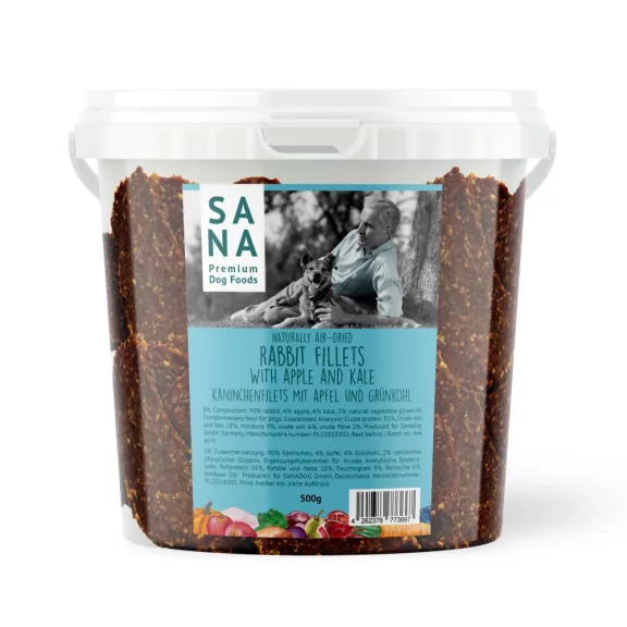 A SANADOG nyúlfilét egy csipetnyi repceolajból származó glicerinnel (egy zsírkomponens) finomítják. Az egészséges glicerin megköti a vizet, és biztosítja azt a puha és rágós textúrát, amelyet a kutyák annyira szeretnek. A SANADOG nyúlfilével kutyája ellenállhatatlanul finom és egészséges nassolnivalót kap az étkezések között.