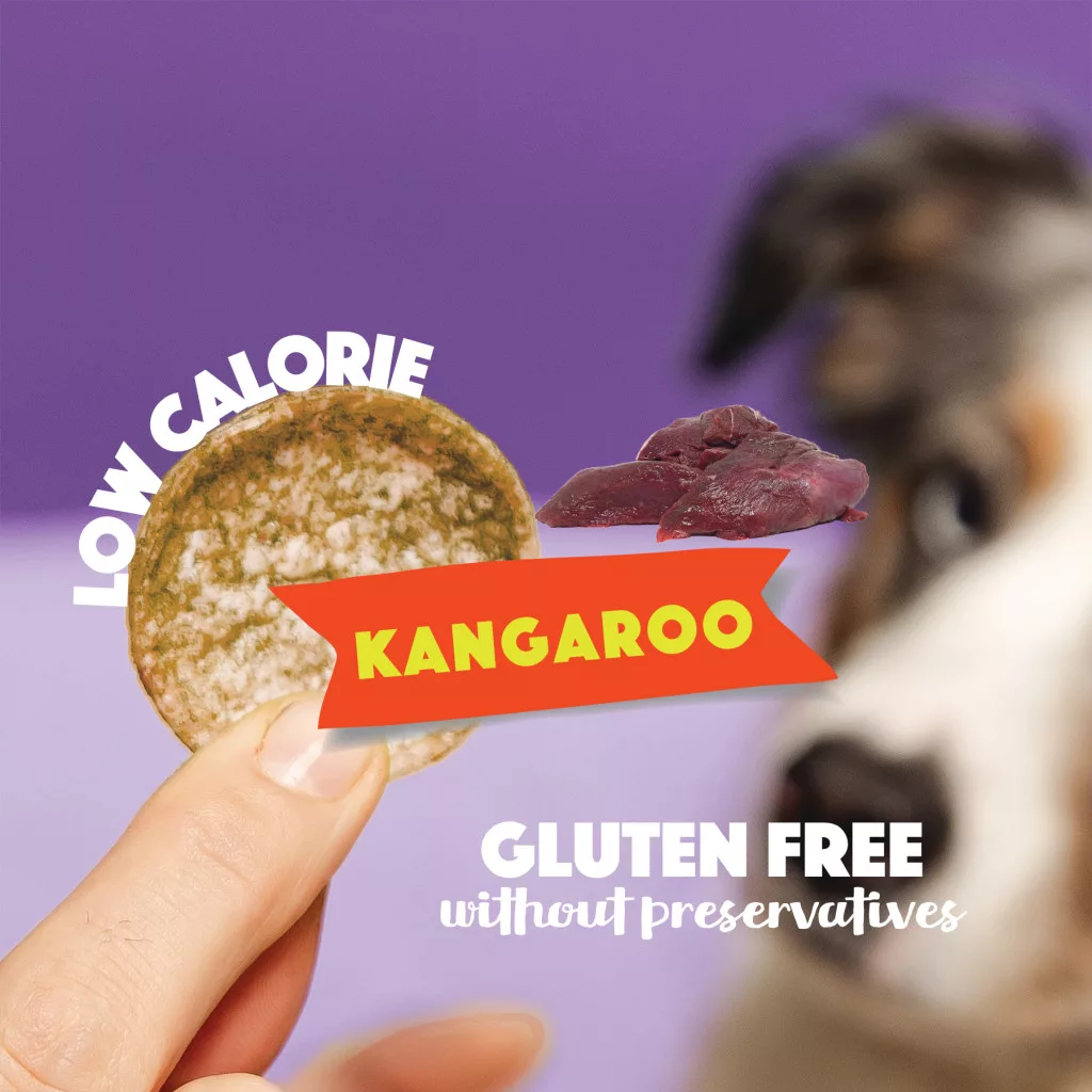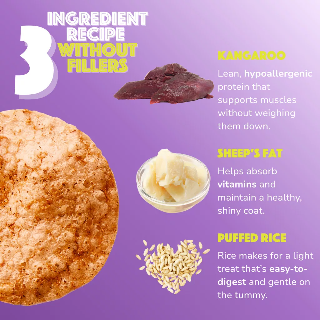 Ez a chips Belgiumban, egy kis műhelyben készül, ahol minden falatot nagy odafigyeléssel, kis szériában állítanak elő. A fő összetevő a rizs (90%), amely gluténmentes, könnyen emészthető és nem terheli meg a kutya emésztőrendszerét. A rizs mellett a chips 8% kenguruhúst tartalmaz, amely egy rendkívül sovány, mono-protein forrás, így ideális választás eliminációs diétán lévő, érzékeny vagy allergiás kutyáknak is. A kenguruhús nemcsak kiváló fehérjeforrás (nyersfehérje: 12,04%), hanem természetes módon támogatja az izomzat fejlődését, a vitalitást és az általános jóllétet.