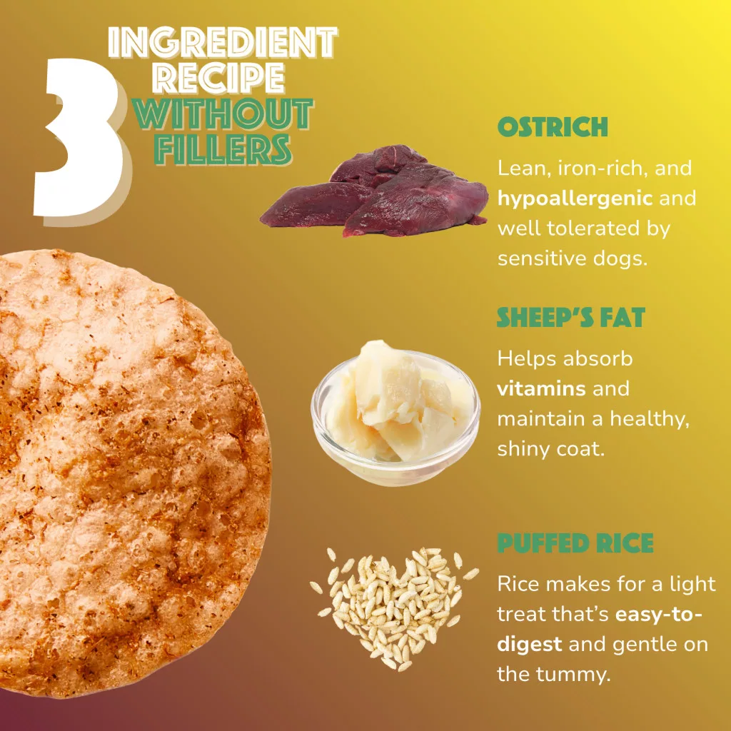 Ez a chips Belgiumban, kis műhelyben készül, ahol minden csomagban a minőség és a gondos odafigyelés garantált. A fő összetevő a rizs (90%), amely gluténmentes, könnyen emészthető, és nem terheli meg a kutya emésztőrendszerét. A rizs mellett 8% strucchús található benne, amely mono-protein fehérjeforrásként kiváló választás allergiás, érzékeny vagy eliminációs diétán lévő kutyáknak is. A strucchús nemcsak különleges és ízletes, hanem természetes módon támogatja az izomzat fejlődését, a vitalitást és az általános jóllétet, miközben könnyen emészthető és alacsony zsírtartalmú.