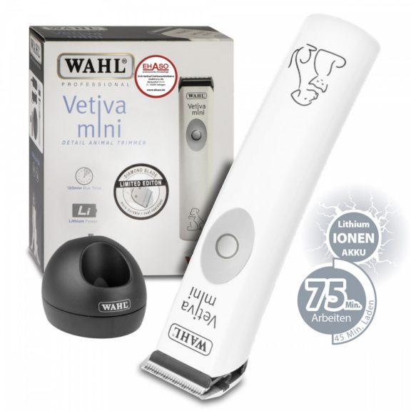 Wahl Vetiva Mini Nyírógép, fej, fülek, hajlatok, tappancsok szőrzetének nyírására. Professzionális és nagyon halk borotva kifejezetten az érzékeny fülű kutyáknak. Keskenyebb nyírófejjel (32mm) rendelkezik, mint a nagyobb nyírók, ezáltal a problémásabb helyeken sokkal könnyebben, praktikusabban használhatő a gép, könnyebb és egyszerűbb a nyírás, fazonírozás.